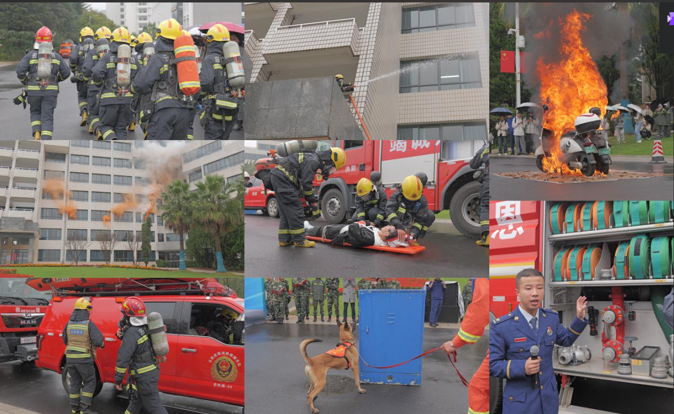 此次活动先后进行了电动自行车失火灭火演练、火灾救援演练、搜救犬展示、消防器材装备讲解等活动。使全校师生提升了消防安全意识和自防自救能力,并对消防救援有了更深刻的认识。最后,公司师生与昆明市消防救援支队世博园大队一起开展了消防宣传游园活动。