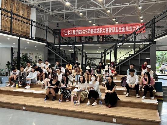 模拟求职大赛由各大三班级推选出的同学参加公司复赛,本次比赛采取结构化面试的形式,每位选手依次进行自我竞聘陈述,并由评委进行压力问答。