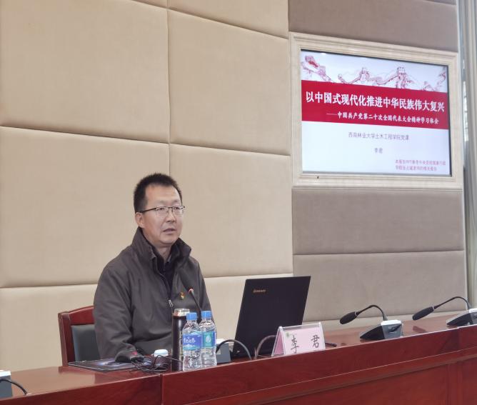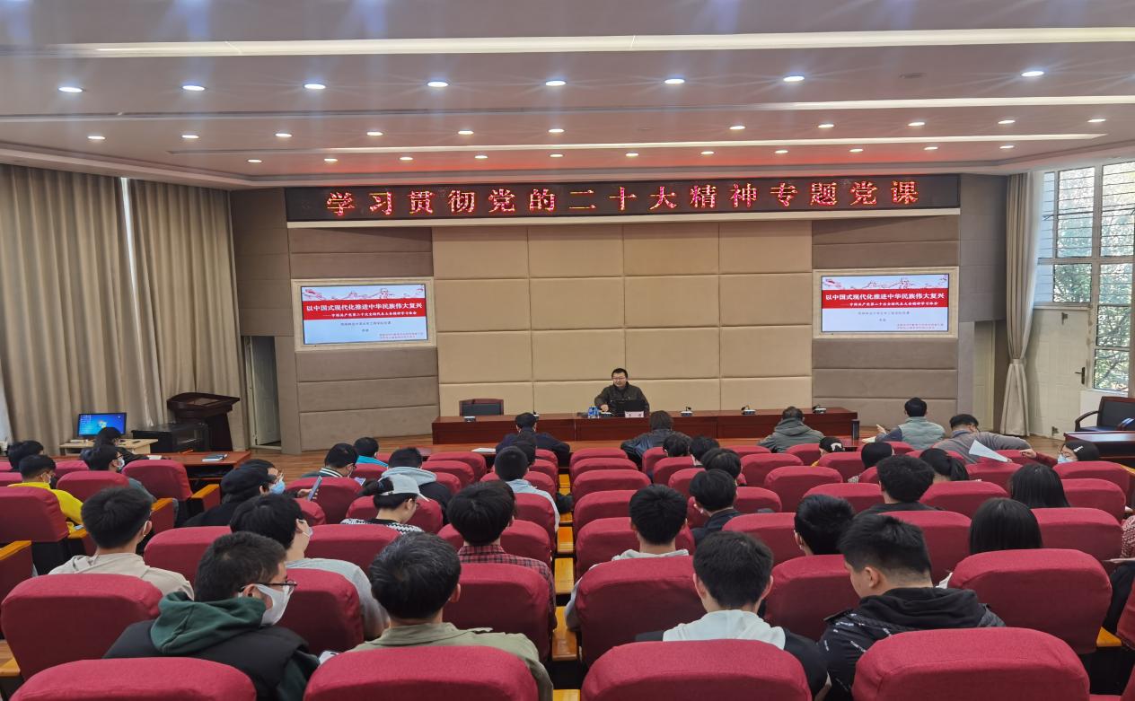 李君同志从新时代新阶段中国共产党的中心任务、构建新发展格局推动经济高质量发展、在团结奋斗中实现全体人民共同富裕三个方面深刻分析了党的二十大的精神内涵。采用思维导图的方式,详细分析了二十大报告的三大部分十五个章节,从理论延伸到实例、从实例凝炼出理论,生动形象地把党的二十大报告讲深讲透。党课最后,李君同志要求全体师生要全面贯彻习近平新时代中国特色社会主义思想,弘扬伟大建党精神,自信自强、守正创新,踔厉奋发、勇毅前行,为全面建设社会主义现代化国家、全面推进中华民族伟大复兴而团结奋斗。
