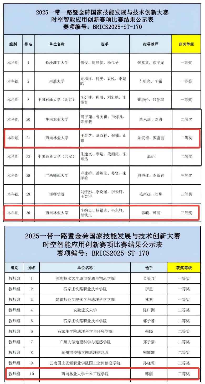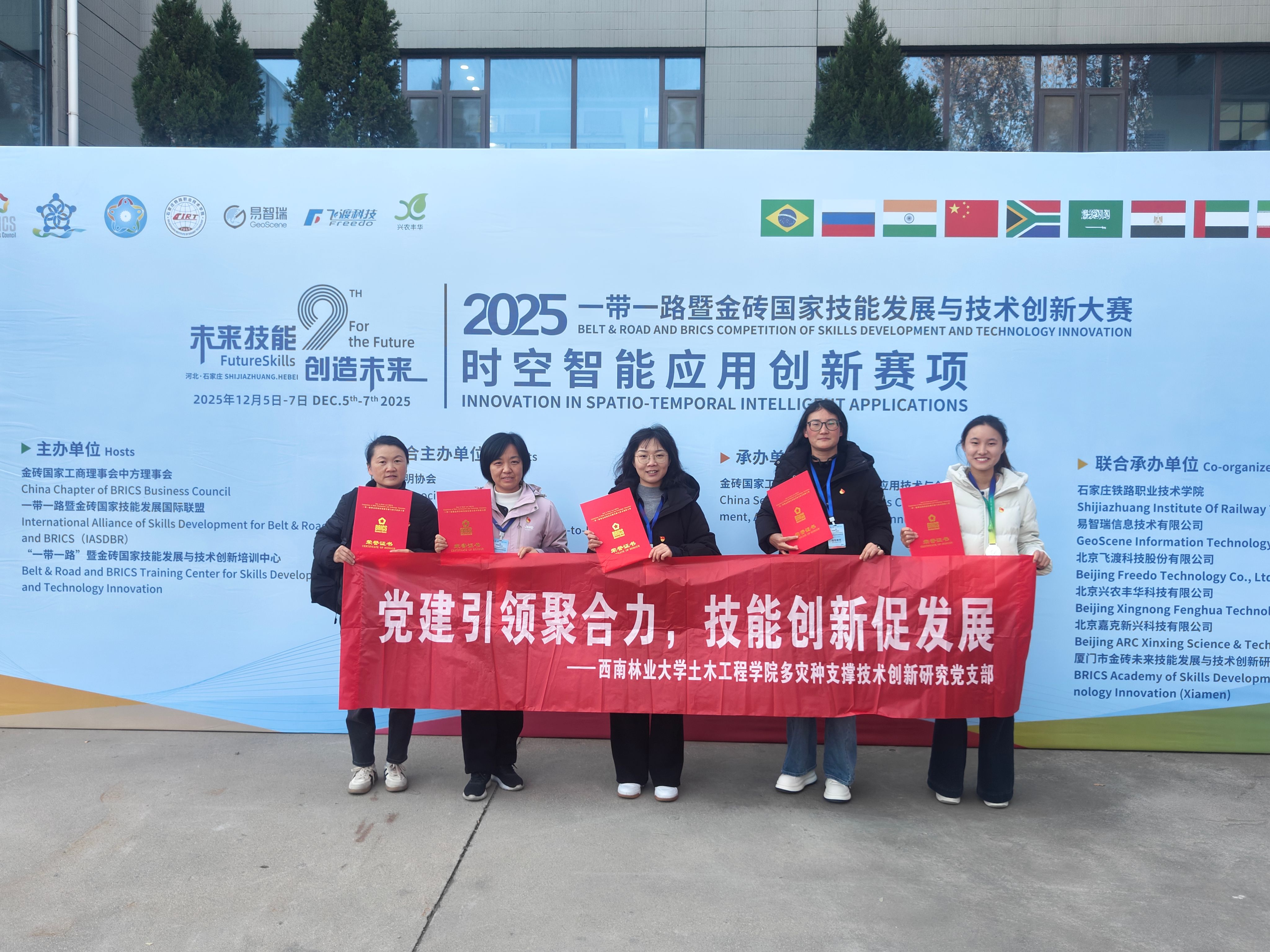 12月5日至7日,2025“一带一路”暨金砖国家技能发展与技术创新大赛时空智能应用创新赛项在河北省石家庄铁路职业技术公司成功举办。在公司多灾种支撑技术创新研究党支部的引领和悉心指导下,测绘工程系师生党员带领参赛团队在此次高水平国际赛事中取得突出成绩,两支员工参赛队分获二等奖和三等奖,韩丽老师荣获教师组三等奖,陈爱梅和罗富丽老师获评“优秀指导老师”,团队同时斩获优秀组织奖。