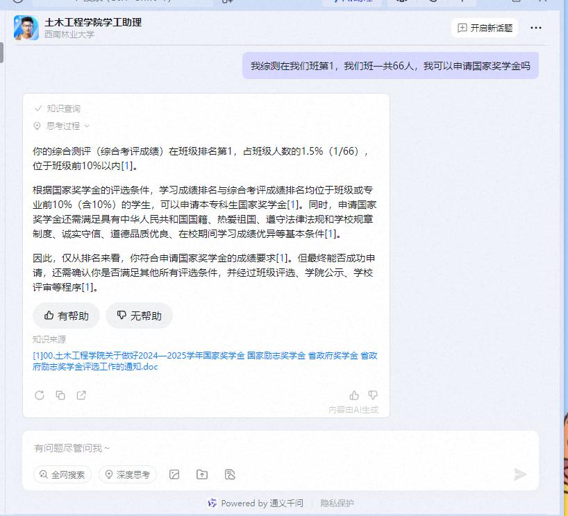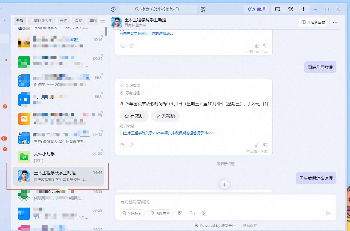AI助手深度融合了本院的教学与管理特色员工可随时获取公司通知信息还能解答关于课程学分、校规校纪、安全规范等员工管理问题,成为员工们触手可及的“智能学工管家”。
